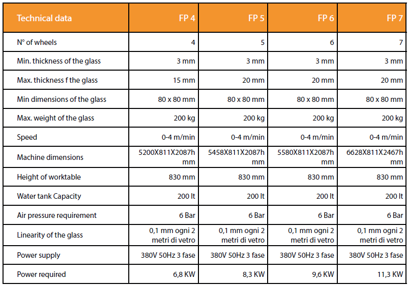 Polishing wheels are controlled by PLC and work automatically while the position of the arris spindles change according with the glass thickness. It is simple and easy to change settings when going from one thickness of glass to another.